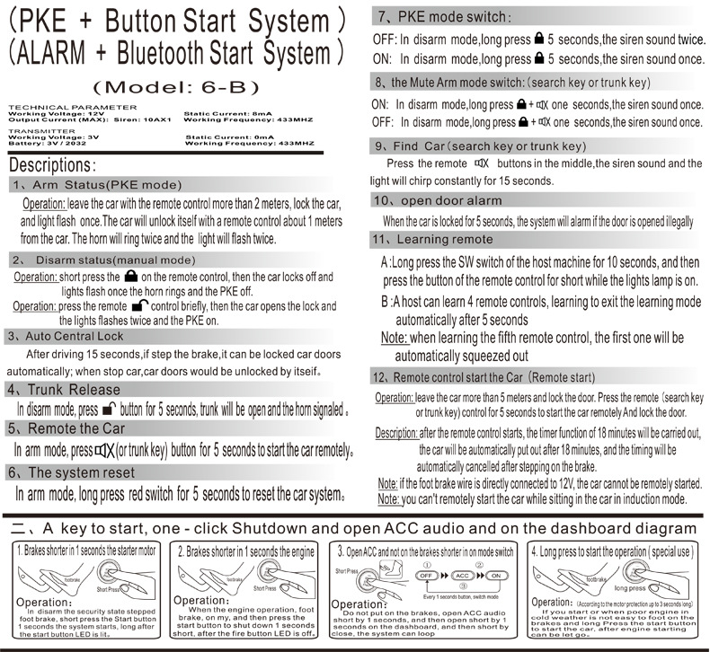 5. Функція захисту від крадіжки: A. Після вмикання сенсорної функції Пульт дистанційного керування не перебуває в діапазоні виявлення, і транспортний засіб не може почати нормально. Через 2 хвилини загоряння двері автоматично увійдуть у пристрій (без блокування дверей), навіть якщо двері не зачинені. B. Під час водіння пульт дистанційного керування залишає транспортний засіб. Коли Паркування вимкнене і двері відчинені, система негайно входить у стан захисту від крадіжки, і транспортний засіб не може бути використано нормально знову, якщо пульт дистанційного керування не з'явиться в діапазоні виявлення. C. Після того, як транспортний засіб потрапить у стан протизагінної системи, він буде незаконно наступати на гальма, і автомобіль зробить 25-секундний звуковий сигнал, щоб звуковий сигнал. D. У режимі захисту від крадіжки, якщо спрацьовує сигнал тривоги, коли розблокування вимкнене, звуковий сигнал звучатиме тричі (безшумний динамік не видає звуку), спонукайте транспортний засіб викликати сигнал тривоги. Е. Вимкніть вогонь і розблокуйте стан. Натисніть на пульт дистанційного керування, щоб увійти в безшумний режим. Якщо спрацьовує будильник, динамік не буде звуковий сигнал. Коли вам потрібно вийти з безшумного режиму, натисніть кнопку розблокування один раз, а потім натисніть