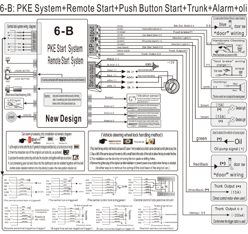 Особливості: Пускова система з однією кнопкою; Віддалене охолодження з дистанційним попереднім нагріванням; Сигналізація PKE; Зручний вхід. Застосовні моделі: 12 В Універсальний бензиновий автомобіль Список товарів: 1* позашляхова безключова сигналізація 2* пульт дистанційного керування 1* Вібратор 1* дріт запалювання 1* функціональна лінія 2* світлодіодний індикатор 2* низькочастотна антена 1* кнопка Запалювання 1* Інструкція з експлуатації