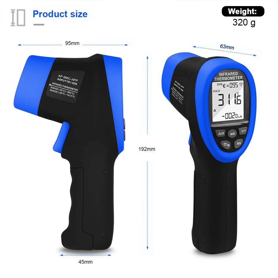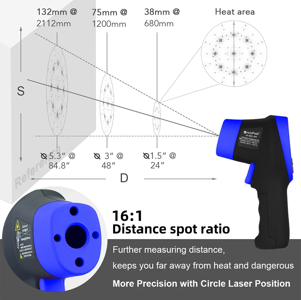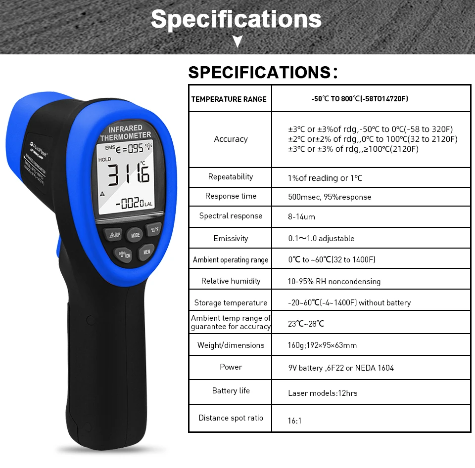 Цифровий інфрачервоний термометр із 9 вбудованими лазерними покажчиками призначений для миттєвого та точного наведення. 16: Використовуючи співвідношення відстані між точками, діапазон вимірювання температури становить від -58 °F до 1472 °F (від -50 °C до 800 °C) з точністю +/-1%. Регульований коефіцієнт випромінювання 0,1-1,0.