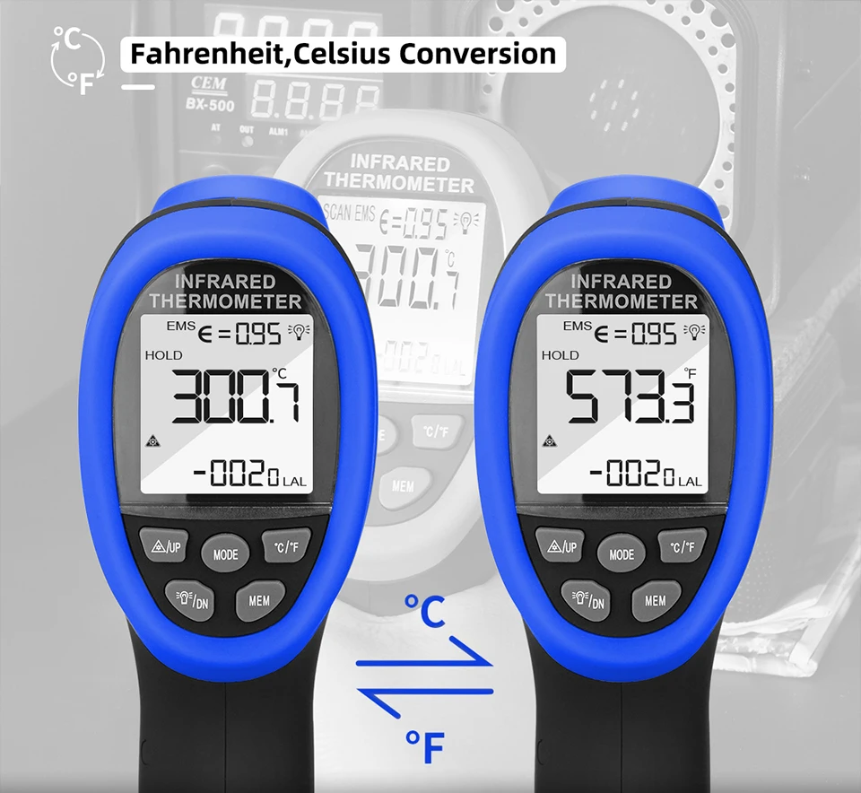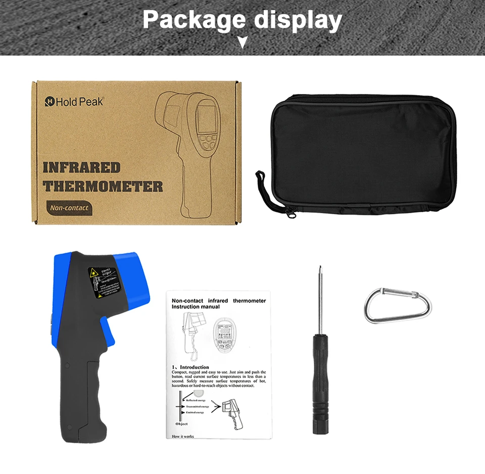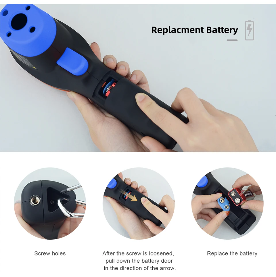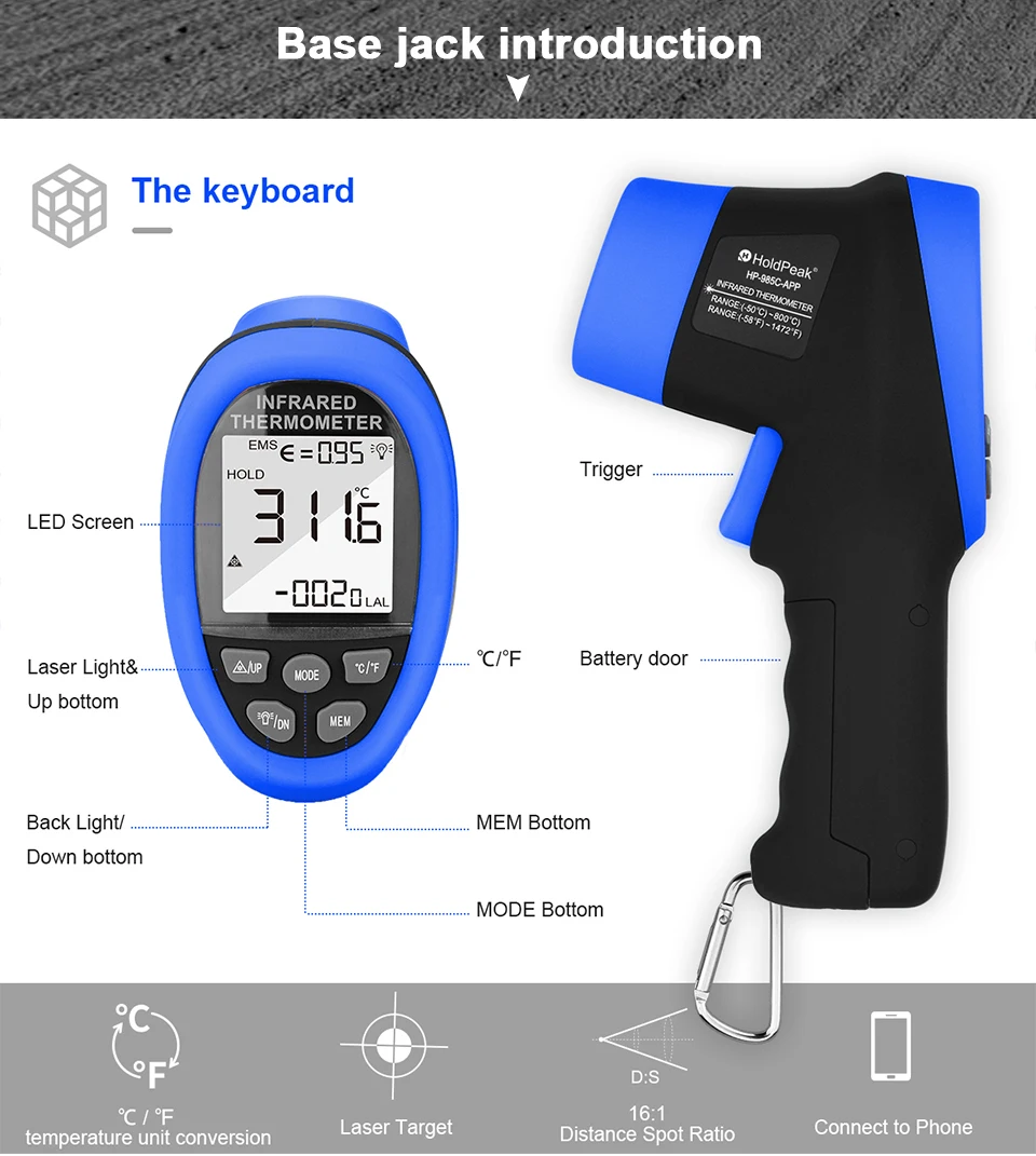 Цифровий інфрачервоний термометр із 9 вбудованими лазерними покажчиками призначений для миттєвого та точного наведення. 16: Використовуючи співвідношення відстані між точками, діапазон вимірювання температури становить від -58 °F до 1472 °F (від -50 °C до 800 °C) з точністю +/-1%. Регульований коефіцієнт випромінювання 0,1-1,0.