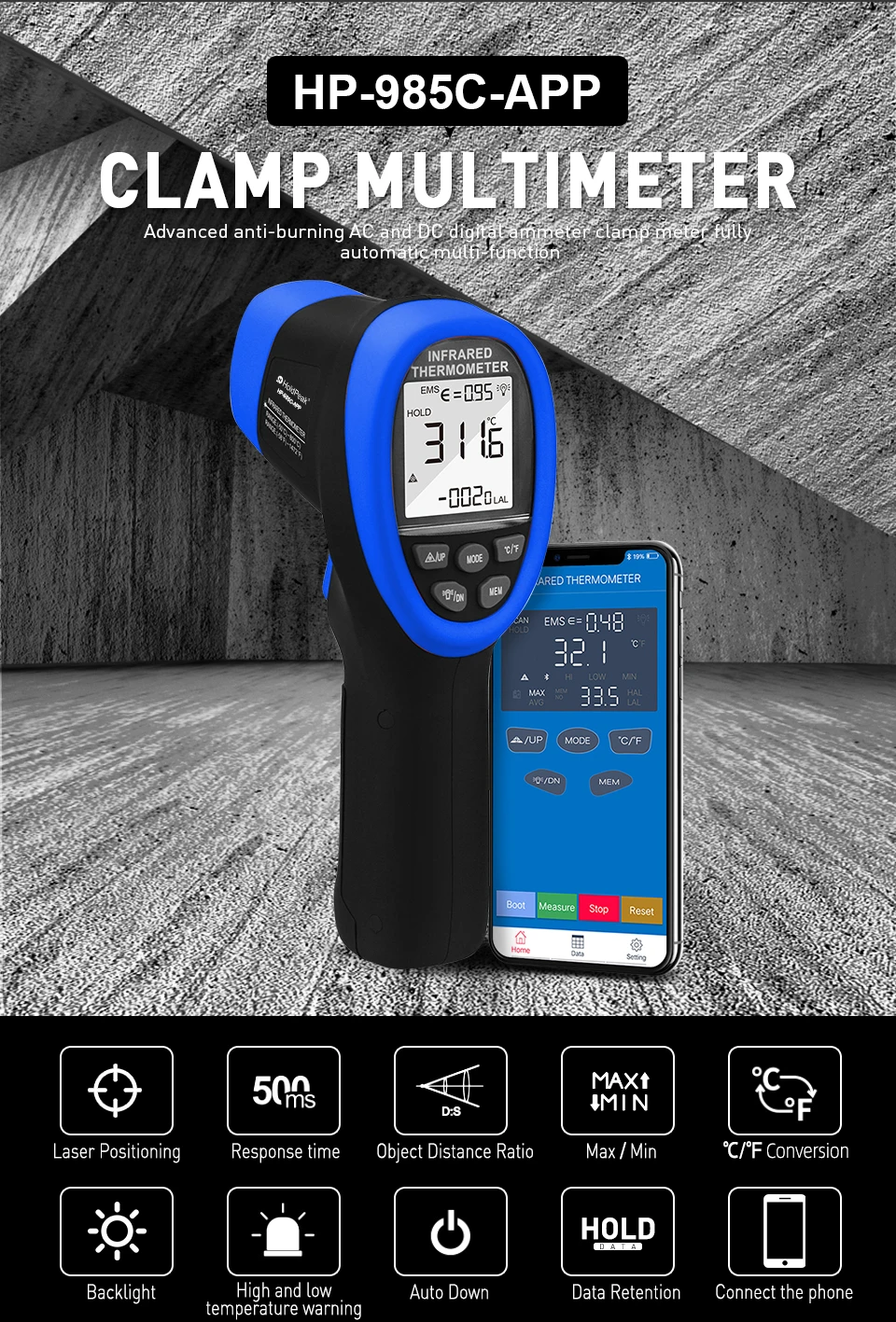 Інфрачервоний термометр має функції зображення максимальної/мінімальної/середньої температури, автоматичного вимкнення, перемикання між °C і °F, збереження і зберігання даних. Індикатор заряду батареї зображається на великому РК-екрані з підсвіткою, а дані чітко зображаються навіть у темряві.