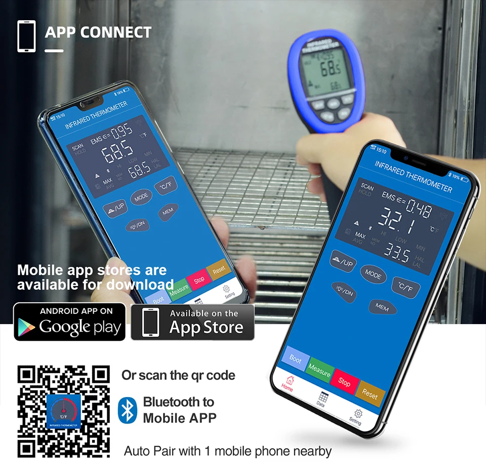 Лазерний термометр автоматично під'єднується до телефона та планшета через Bluetooth-застосунок. У нижній частині пристрою є металевий отвір для гвинта, що дає змогу встановити термометр на штатив для безперервного вимірювання та записування результатів. Підтримується експорт в Excel або TXT.